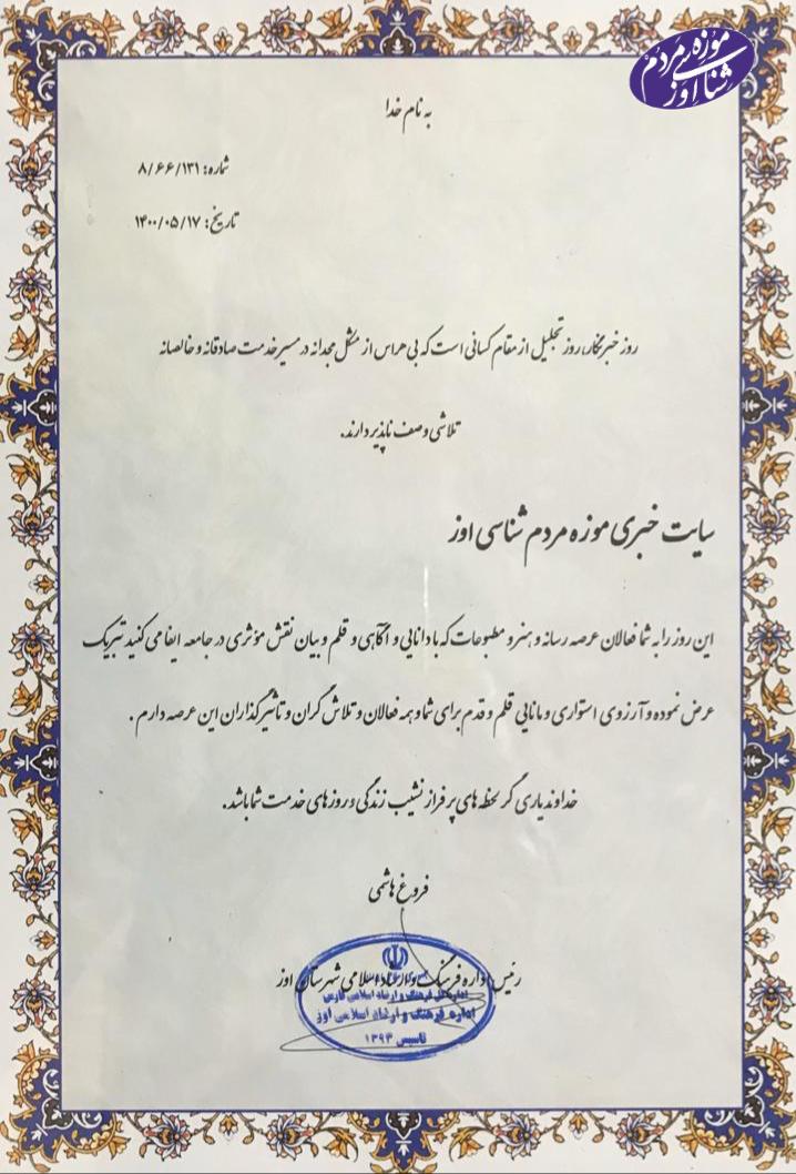 محمد رفیع راوند: تقدیر رئیس فرهنگ و ارشاد اسلامی اوز از پایگاه خبری موزه اوز به مناسبت روز خبرنگار ، فروغ هاشمی رئیس اداره فرهنگ و ارشاد اسلامی شهرستان اوز به همراه ریحانه حسینی و ناصر رفیعی طی دیداری از موزه اوز ، ضمن تبریک روز خبرنگار به مسئول و همکاران پایگاه خبری موزه از آنان درخواست نمود تا با پشتکار بیشتر در امر اطلاع رسانی ، اخبار و رویدادهای شهرستان اوز را با دقت به اطلاع مخاطبین برسانند . ایشان ضمن تقدیر و تشکر از مسئولین موزه که توانسته اند به نحو مطلوب نمایشگاه نشریات و پایگاه های خبری را در نگار خانه شریف واقع در موزه دایر نمایند و همچنین ابتکار معرفی این رسانه ها را از طریق روبیکا و با همکاری آقای خوشه چین و به صورت انلاین انجام دهند تشکر نمودند . شریف بازرگانی مسئول پایگاه خبری موزه نیز ضمن تشکر از فروغ هاشمی و ریحانه حسینی وناصر رفیعی ، رئیس و همکاران اداره ارشاد از آنان به خاطر حمایت های فکری و معنوی تشکر نمود . در پایان لوح تقدیر مزین به گل و یک عددکارت هدیه به پایگاه خبری موزه اهدا گردید .