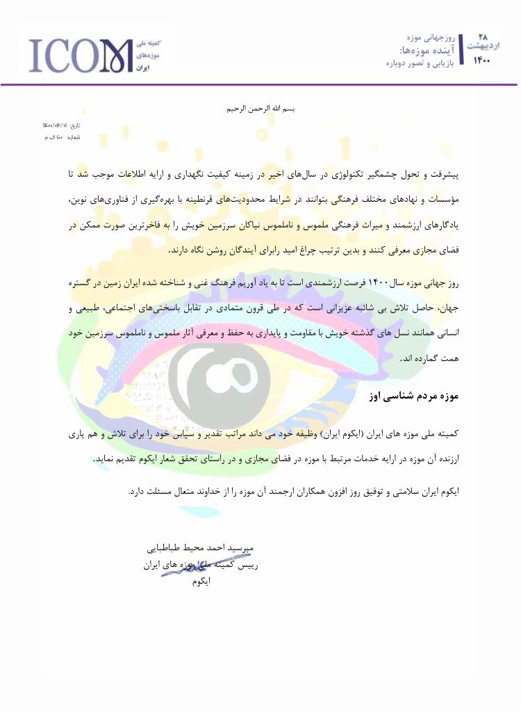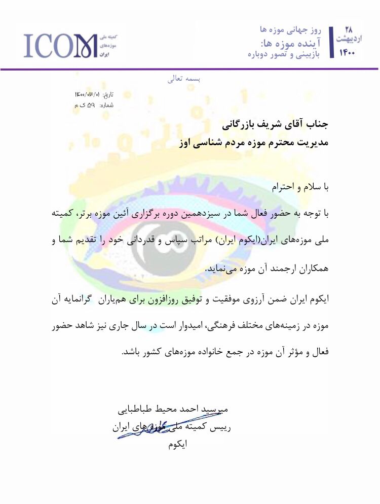 تقدیر میر سید احمد محیط طباطبایی ریاست کمیته ملی موزه های ایران ( ICOM ) از موزه مردم شناسی اوز به مناسبت فعالیت های گسترده موزه اوز در مناسبت های مختلف و همچنین تلاش مدیریت و کارکنان و همراهان موزه در معرفی آیین ها و مراسم اقوام ایرانی در فضای مجازی همراستا با اهداف ایکوم