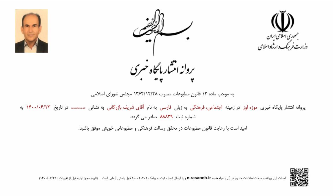 مجوز رسمی پایگاه خبری موزه اوز از سوی وزارت فرهنگ و ارشاد اسلامی ایران صادر گردید .